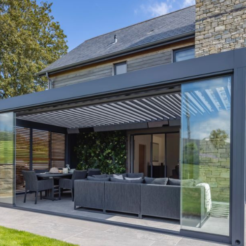 Cubierta: pérgola con lamas orientables o lona impermeable.
